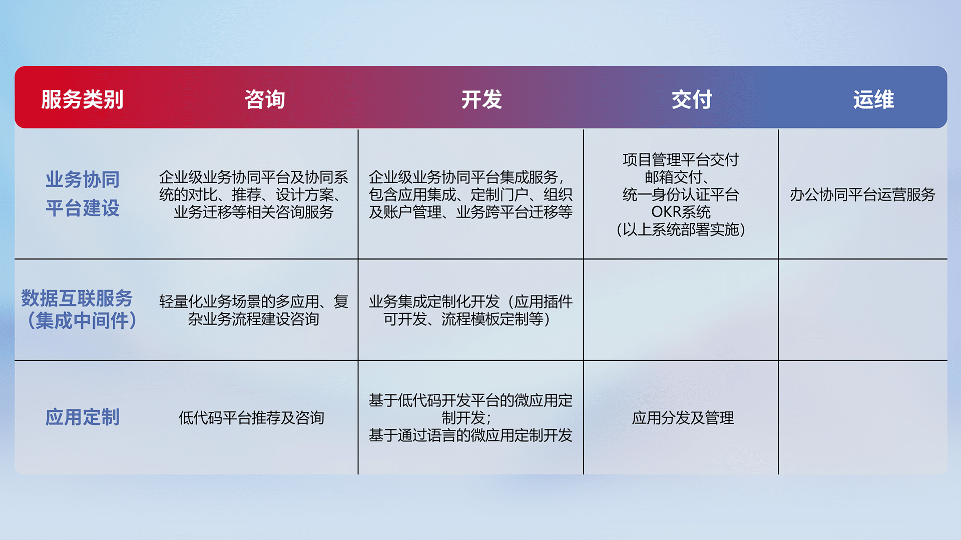 针对钉钉、、企微、、IDaas等平台级产品提供产品的规划、、、、方案、、、、交付、、、定制化开发等服务,,实现如统一协同办公、、智能客户服务、、、、混合会议管理、、、智能数据查询、、等业务场景,,实现数字化转型。。
