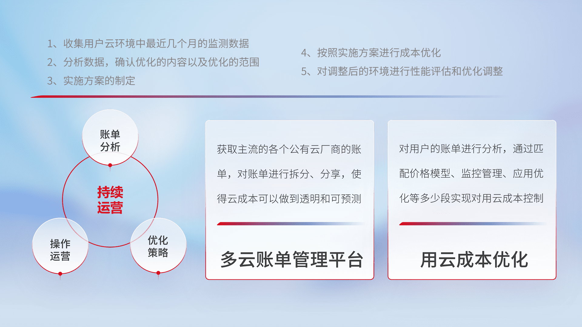 通过多云纳管,,,,以统一的资源数据模型把客户的云资源进行抽象和封装,,,,进而实现对多云资源的统一操作,,保障云资源管理的可靠性、、稳定性与可用性。。。。量身定制化运维内容,,,,配置、、、、开发运维、、、补丁管理、、、、备份、、、监控、、、、认证和访问管理、、、审计和日常巡检等,,,,保障在用云过程中的可靠度,,,,稳定度以及高可用率。。
