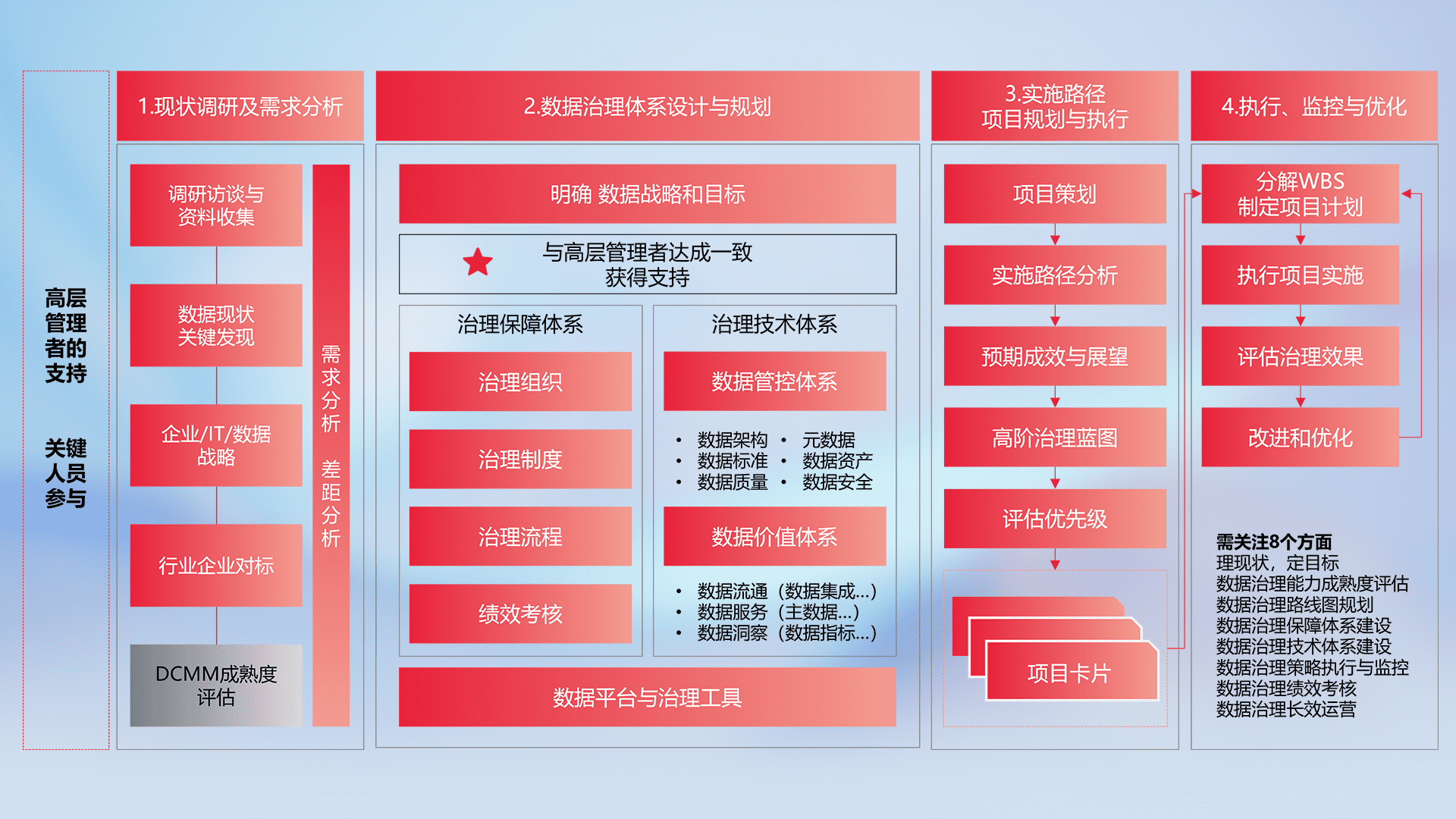 制定并执行统一的数据标准,,,,规范数据定义和格式,,,,消除冗余和不一致性,,实现跨部门和跨系统的数据一致性,,,为企业提供标准化的数据基础。。